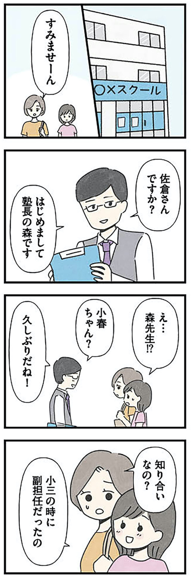 ある日、娘の成績が落ちていることに気付いた真美は、塾に通わせることに。小春を連れて塾へ行くと、娘の小学生時代の副担任・森先生に再会する。