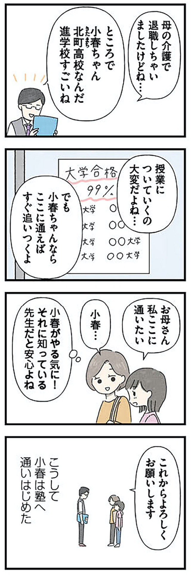 熱心に小春に勉強を教えてくれる森先生。おかげで小春の成績も上がっていき、安心していたが、小春が「ママに会わせたい人がいる」と言い、交際相手として連れてきたのはなんと塾長の森先生だった…。