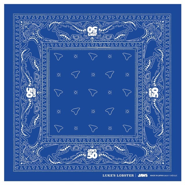 映画『ジョーズ』の50周年ロゴとLUKE'S LOBSTERのオリジナルデザイングッズ。ファン必見の限定グッズ第1弾は、タンブラーとトートバック。映画の世界観を身近に感じられるデザインで、コレクションとしても楽しめる。第2弾はブルーを基調とした、オリジナルのバンダナが登場する。