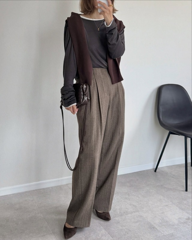 秋仕様のGU 「ヘリンボーンハイウエストパンツZ E」3,990円(160でMサイズ着用)を使った新鮮な着こなしです。こちらはヘリンボーン生地で、履くだけで既に秋のムードを演出。通常の生地よりも奥行きがあり、高見えする素材です。トップスにはダークトーンのインナーと、ブラウンのジレを重ね、全身を落ち着いたトーンで統一することでシックで洗練された印象に。このパンツは、ウエストサイドにベルトつきのデザインがあるため、腰の位置を高く見せつつ、お腹周りがすっきり見えるのがポイント。