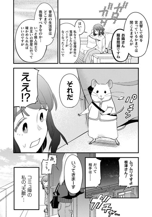 考えすぎOLは喋るネズミをトレーナーにコミュ障を克服できるか?コミュ障OL小宮さんは、ある朝、駅でお菓子をぶちまけてしまう。それを口にしたネズミの根津さんは、空腹を満たしてくれた小宮さんに「お礼に何か願いを叶えてさしあげましょう」と申し出る。思わず「コミュ障を治したい」と答えた小宮さんは、根津さんの助言のおかげで、徐々に他人に話しかけるようになる…一人と一匹のハートフルコメディをお楽しみください。