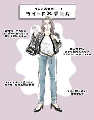 しかし、先ほどもお伝えしたようにツイードジャケットは時々、流行するもの。また、ブームがやってきたタイミングで昔のような着こなしをすると、一気に時代に取り残された古いおばさんコーデになりかねません……。