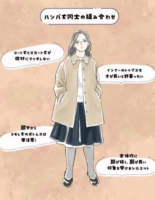 ハンパ丈のアウターに組み合わせるスカートやパンツは、丈も同じくハンパ丈にしてしまうとバランスが悪く見えて、短足胴長といった印象を与えかねません。ハンパ丈アウターの多くは太ももの中間くらいまでの丈感です。それにミモレ丈(ふくらはぎ)のスカートや7分丈のパンツを合わせるのはNGです。