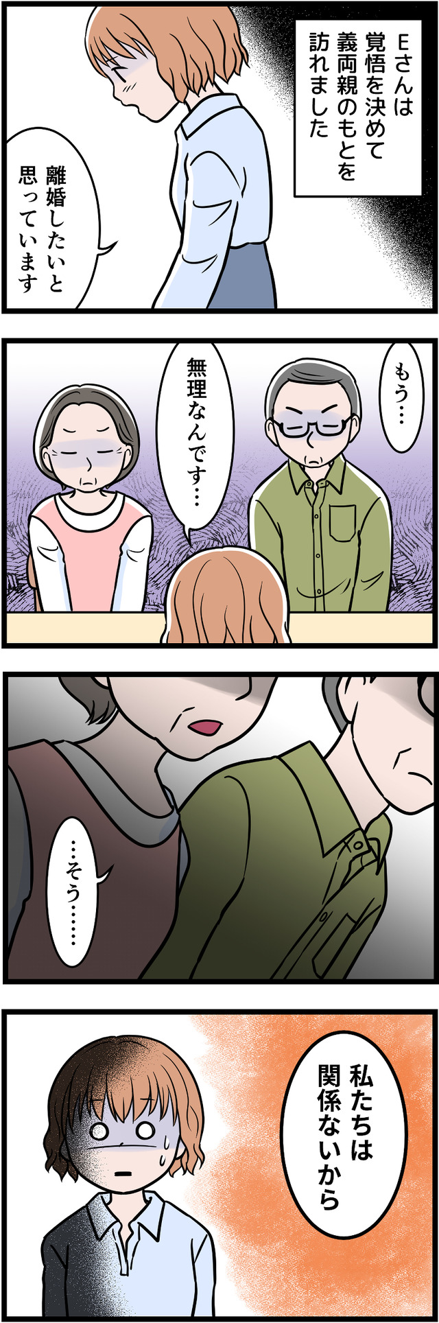子どもだちの前でも暴言を吐くようになった彼。「再婚さえしなければ、こんな思いはしなくてすんだのに……」その思いが募り、Eさんは覚悟を決めて、義理の両親に相談に行くことにしました。