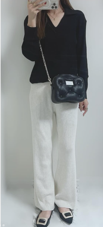 シンプルなのに今っぽい。そんな程よいきれいめが叶うのが、ユニクロの「ウォッシャブルニットリブポロセーター」2,990円(160cmでサイズM着用)。チクチク感のないやわらかな肌ざわりで、1枚でも重ねてもサマになる万能ニットです。デコルテをきれいに見せるVネックと、細めのリブがつくる縦ラインで、すっきりとした印象に。ブラックを選べばシックでモードに、ホワイトなら軽やかで女性らしい雰囲気に。どちらのカラーも、パンツにもスカートにもマッチするバランスのよさが魅力です。セットアップ風に着れば、オフィスでも週末のお出かけにもぴったり。