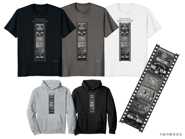 この度登場するのは、根強い人気を誇る「松竹映画100周年ロゴ」「松竹富士山ロゴ(カラー&モノクロ)」に続く、松竹オープニングロゴシリーズの第3弾。モノクロのロゴにちなみ、Tシャツは黒・白・チャーコールグレー、パーカーは黒・白と秋冬にぴったりのシックなカラーで展開。