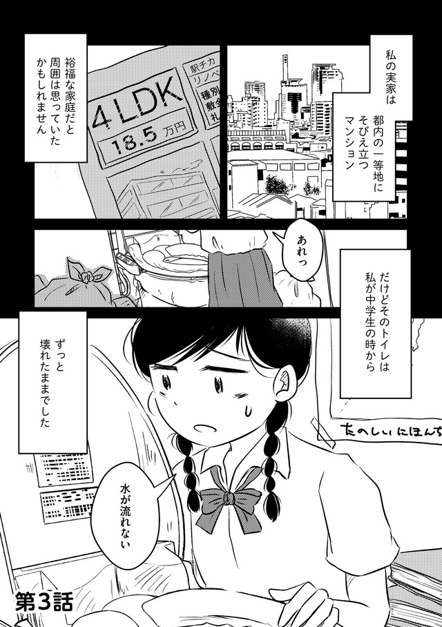 都心の一等地、家賃18.5万のマンション。トイレは7年間壊れたまま、まな板や包丁は害虫の通り道。やがて「パパ」は来なくなり、私は「美しいママ」とふたりきりになった。