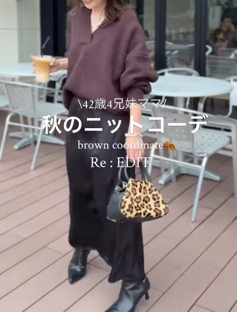 インフルエンサー@midopei さんが選んだブラウンは、深いVネックとボリューム袖のニット。落ち着いた大人の女性の魅力を引き出しています。