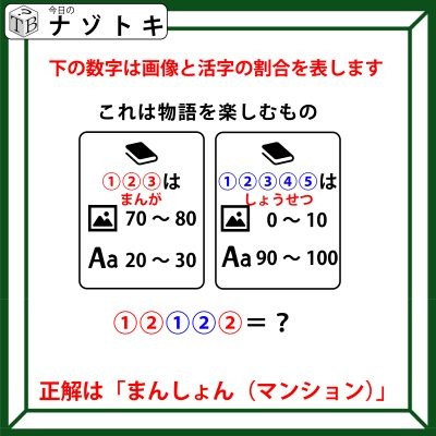それは左は「まんが(漫画)」、右は「しょうせつ(小説)」です。確かに作品によって微妙な違いはありますが割合的には一致します。