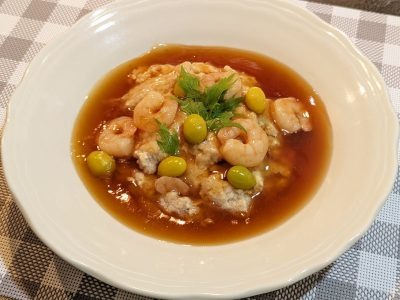 次に“えび&銀杏あん”を作ります。えび(小10尾)は殻をむいて背ワタを取り、銀杏は殻を割って中身を取り出します。これらを鍋に入れて、水(200ml)・鶏ガラ粉末(大さじ1)・りんご酢(小さじ1)・みりん(小さじ2)・しょうゆ(大さじ1)・酒(小さじ1)を加えて火にかけ、沸騰したら水溶き片栗粉(片栗粉:大さじ1)でとろみをつけます。