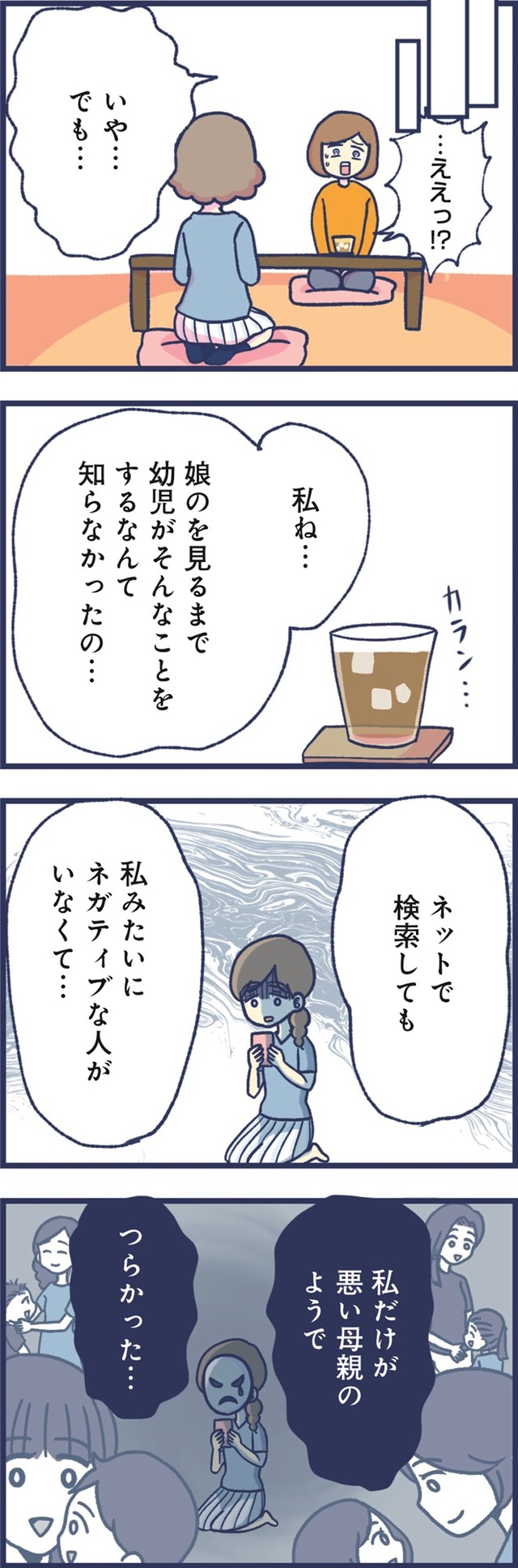 2人目を出産後、甘えてくるようになった4歳の長女。そんなある日、長女が自慰行為にふけっている現場を見てしまい、主人公は大きな衝撃を受けます。ネットで調べても「よくあること」「見守ってあげましょう」という言説ばかりで、母親の葛藤に寄り添うようなものは見当たりません。「娘が気持ち悪い」そう思ってしまう自分に苦しむ日々のなかで、徐々に追い詰められて……。今回は、幼すぎる性の目覚めに葛藤する母娘の苦しみを鮮烈に描いたコミックエッセイを特別抜粋でお届けします。