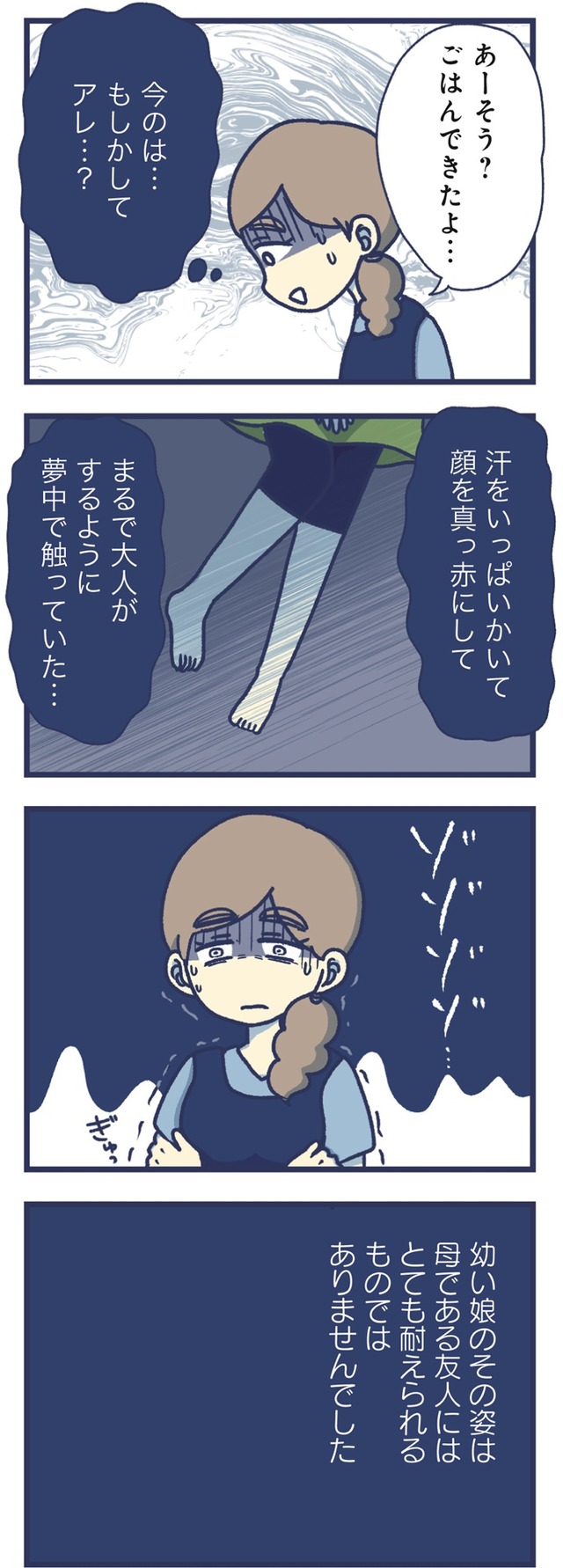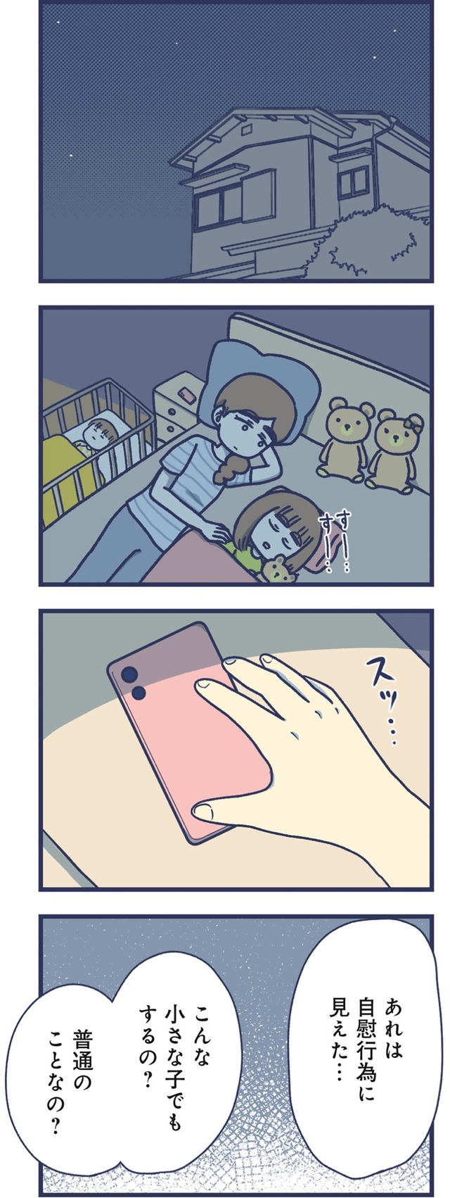2人目を出産後、甘えてくるようになった4歳の長女。そんなある日、長女が自慰行為にふけっている現場を見てしまい、主人公は大きな衝撃を受けます。ネットで調べても「よくあること」「見守ってあげましょう」という言説ばかりで、母親の葛藤に寄り添うようなものは見当たりません。「娘が気持ち悪い」そう思ってしまう自分に苦しむ日々のなかで、徐々に追い詰められて……。今回は、幼すぎる性の目覚めに葛藤する母娘の苦しみを鮮烈に描いたコミックエッセイを特別抜粋でお届けします。