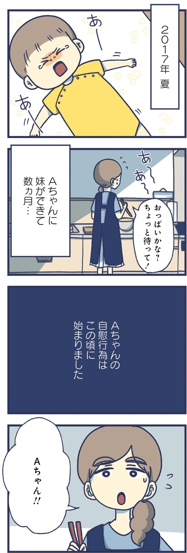 2人目を出産後、甘えてくるようになった4歳の長女。そんなある日、長女が自慰行為にふけっている現場を見てしまい、主人公は大きな衝撃を受けます。ネットで調べても「よくあること」「見守ってあげましょう」という言説ばかりで、母親の葛藤に寄り添うようなものは見当たりません。「娘が気持ち悪い」そう思ってしまう自分に苦しむ日々のなかで、徐々に追い詰められて……。今回は、幼すぎる性の目覚めに葛藤する母娘の苦しみを鮮烈に描いたコミックエッセイを特別抜粋でお届けします。