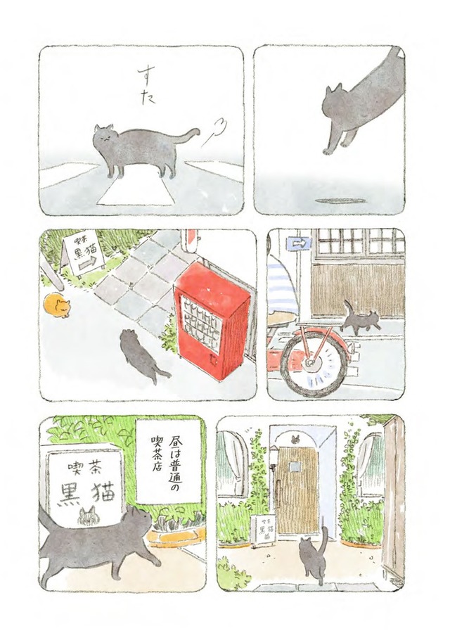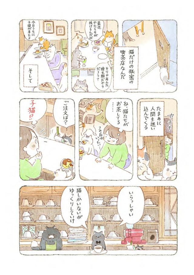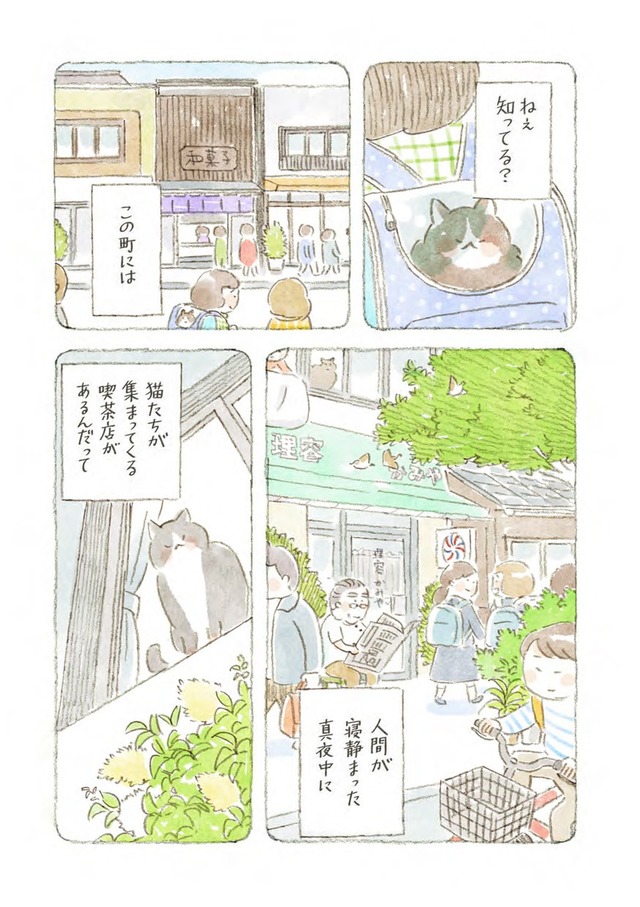 真夜中に猫が集まる喫茶店に迷い込む悩める人間たちが、猫たちとおいしいメニューに癒されるストーリー。