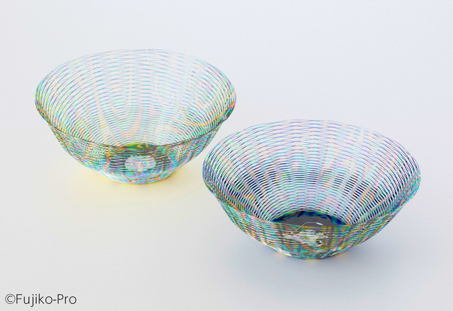 ドラミちゃんの可愛らしいひみつ道具をモチーフに、両面リバーシブルで2種類の柄が楽しめる、空気の器シリーズのドラミちゃんバージョン。おもて面はタイムマシンの時空間をイメージし、全面にメタリックな箔をあしらったSF未来感溢れる仕様になっている。