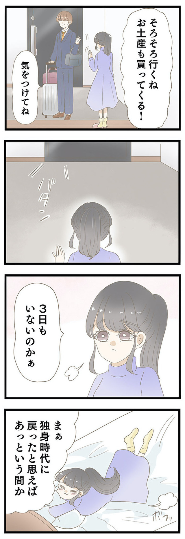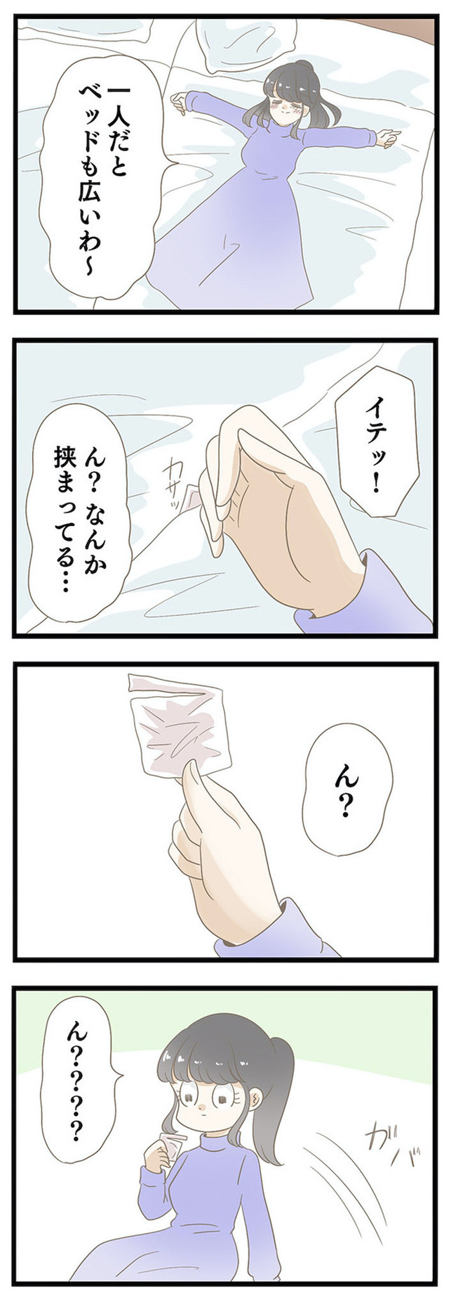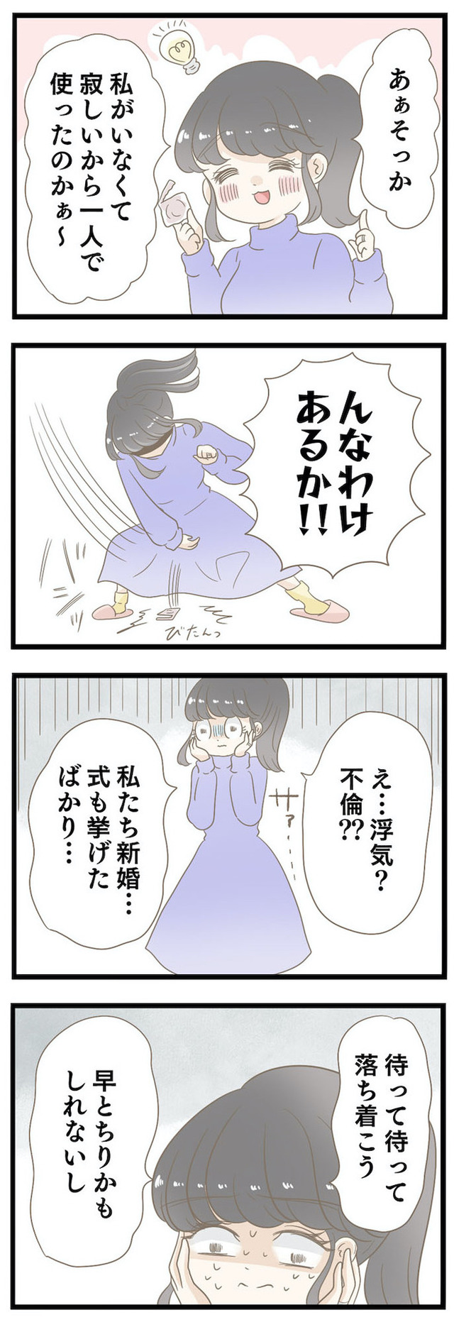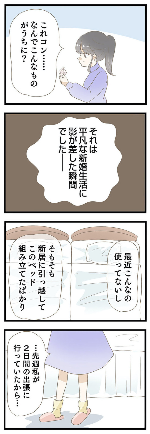 出張に行く夫を見送った後、新居のベッドルームで夫の不倫の証拠を見つけてしまう。