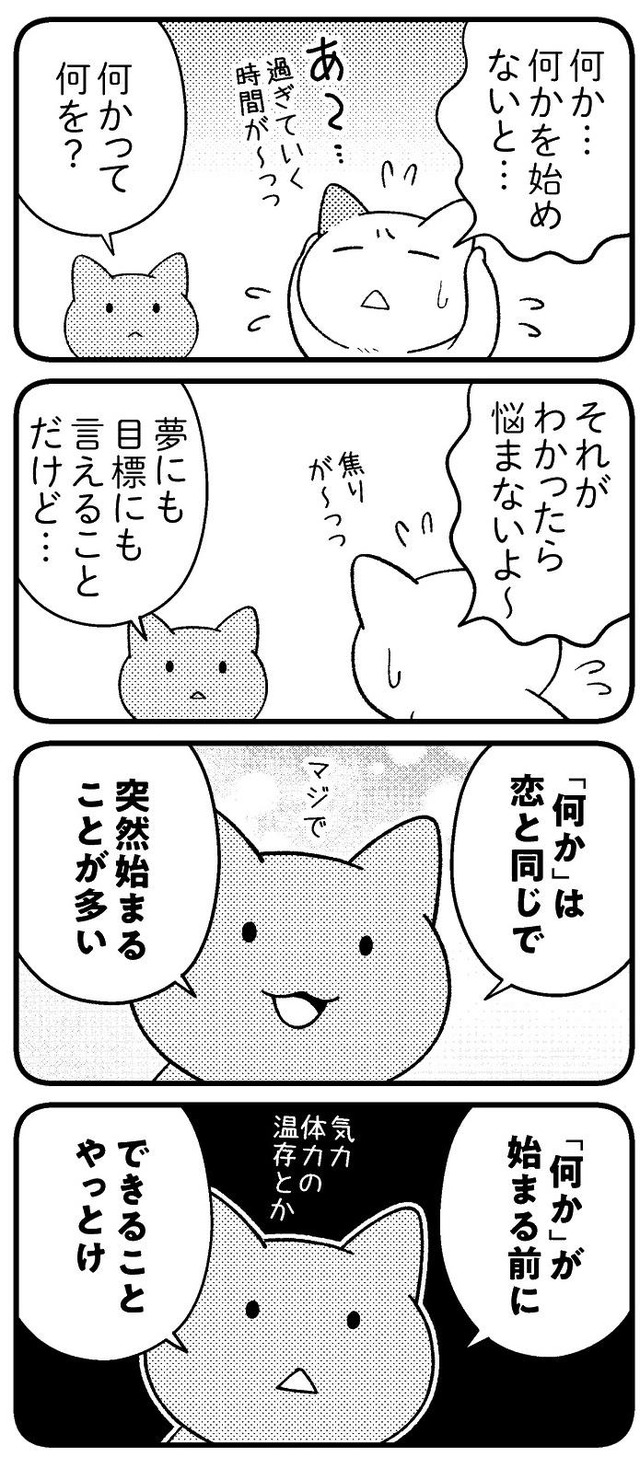 「何かを始めなくちゃいけない」。よくそんな言葉を耳にしますが、私は「何か」が「何か?」をわかってないときは、焦らずに構えていたほうがいいと思います。「何かを始めなくちゃ」の「何かは、「恋」みたいなものだからです。