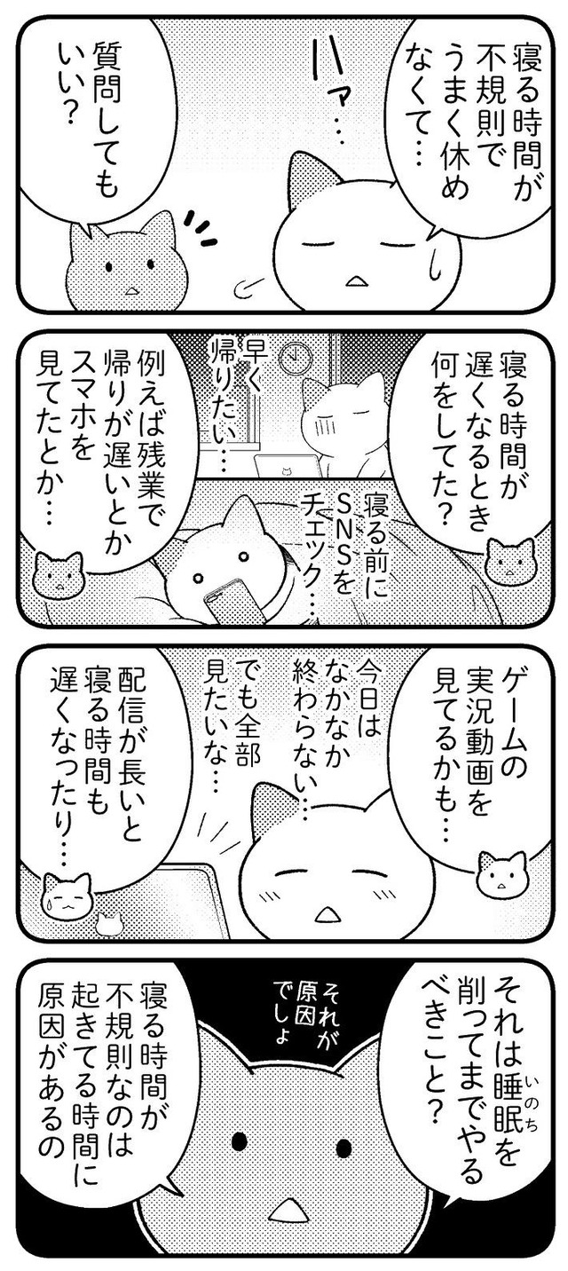 ネットを見たりゲームで遊んだり、夜遅くまで何かやって夜更かししてしまう人は、それが本当に、「健康を削ってまでやらなければいけないことか」、考えてみてください。睡眠を削るって命を削る行為です。後回しにしないで、一度、まじめに考えたほうがいいと思うんです。