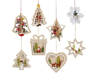 【木製オーナメント】トナカイや雪の結晶など全て違うデザインの8枚セット。窓辺やツリーに下げたり、プレゼントに添えたりしてもおしゃれ♪