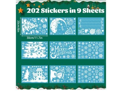 FINGOOO クリスマス ステッカー 窓 シール 飾り 9枚 20×30CM・202pcs ウォールステッカー 剥がせる ジェル 静電気 ガラス 防水 両面 汚れない ホワイト (クリスマス 白)