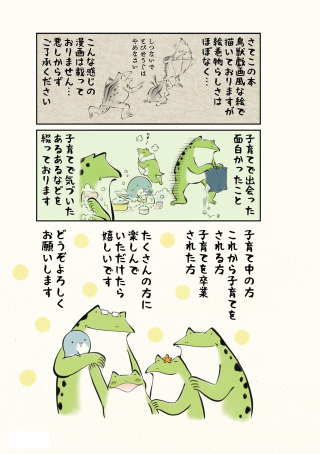 インスタで大人気のユウコトリトリが描く『カエル母さん』は、カエルの長男とおたまじゃくしの次男を中心に育児や家事の“あるある”を鳥獣戯画風にコミカルに描いた四コマ集。