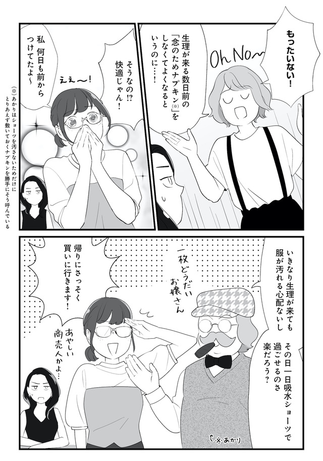 生理痛やPMSに苦しむあかり。通勤中、貧血で倒れて病院に運ばれたことをきっかけに、自分にあった生理用品や治療法を教えてもらうことに。