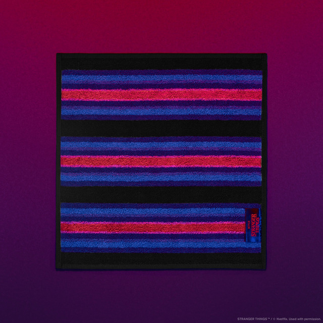 内容:「ストレンジャー・シングス 未知の世界」をモチーフに配色した今治製のハンドタオルで、高吸水仕様です。ストレンジャー・シングスのオリジナルタグが付いている。