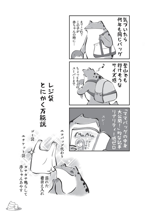 インスタで大人気のユウコトリトリが描く『カエル母さん』は、カエルの長男とおたまじゃくしの次男を中心に育児や家事の“あるある”を鳥獣戯画風にコミカルに描いた四コマ集。
