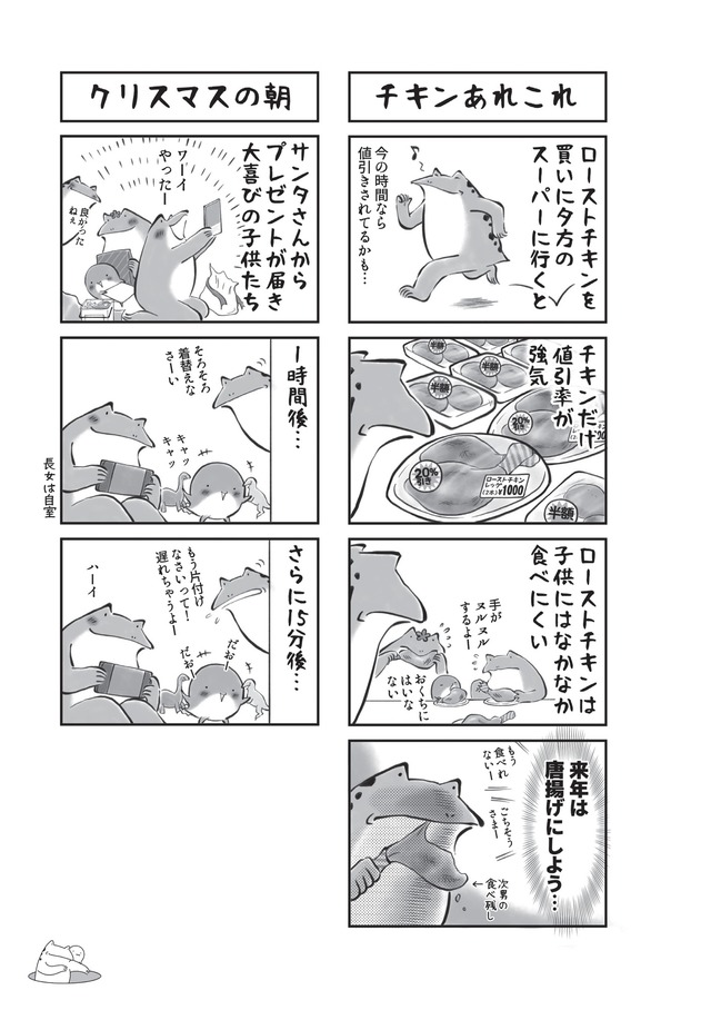 インスタで大人気のユウコトリトリが描く『カエル母さん』は、カエルの長男とおたまじゃくしの次男を中心に育児や家事の“あるある”を鳥獣戯画風にコミカルに描いた四コマ集。