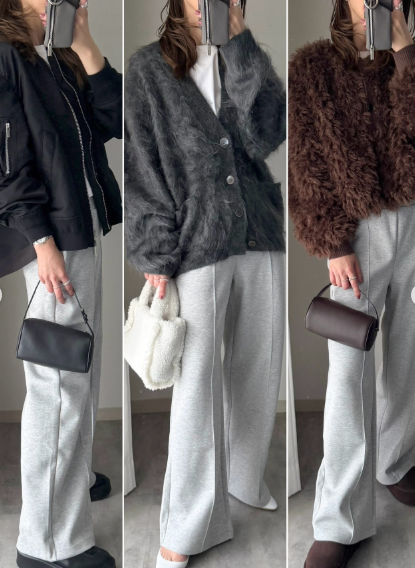 カジュアルなスウェットパンツを、きれいめアイテムとして着こなすテクニックが光るコーディネート。