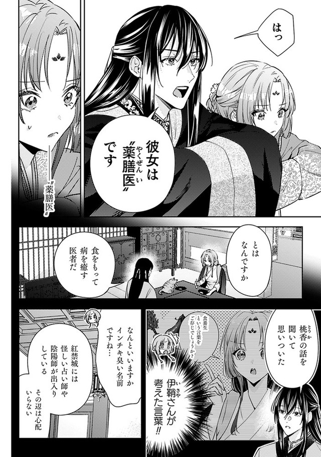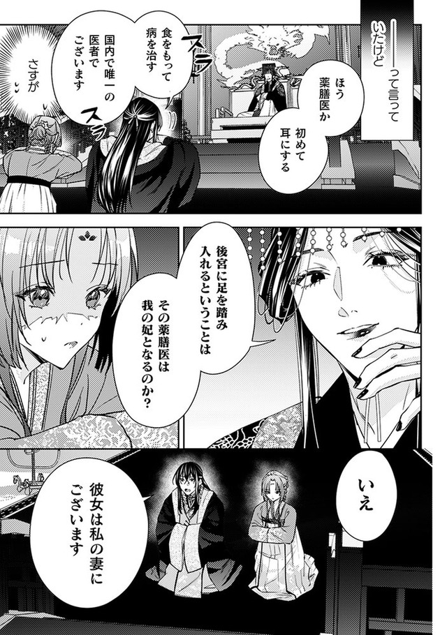 しかし火事が起きて店は消失。食堂の常連で後宮に仕える美しい青年、陽伊鞘に救われるが、彼の頼みで後宮付きの薬膳医になることに。