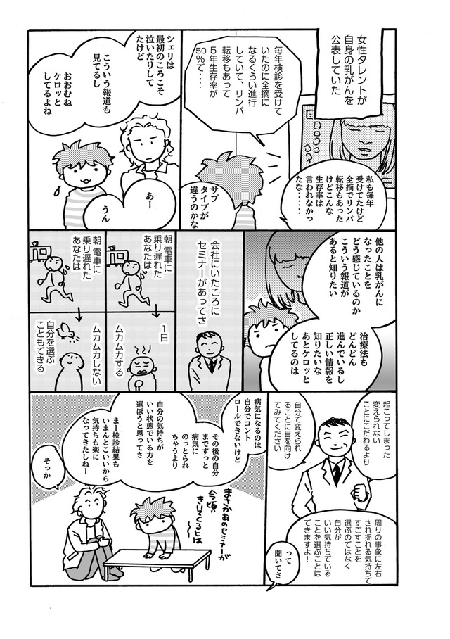 年一の健康診断で再検査の連絡が!そしてまさかの乳がんが判明!「病院ってどうやって選べばいいの?」「乳房の再建ってどうするの?」「お金はどれくらいかかる?」「術後ってどんな感じ?」家族やママ友、乳腺外科医、形成外科医、たくさんの人と関わりながら乳がんを乗り切る姿をポジティブに描く闘病マンガ。