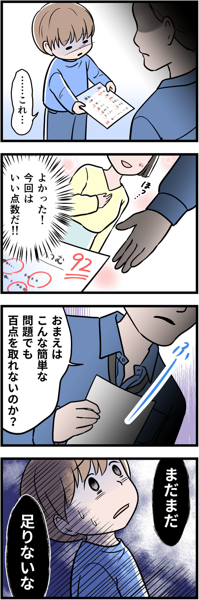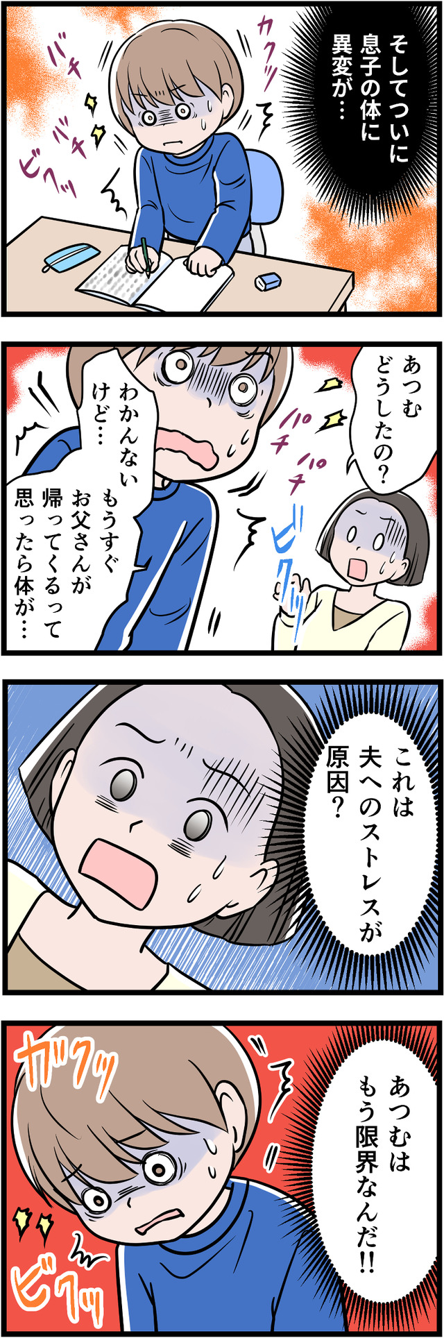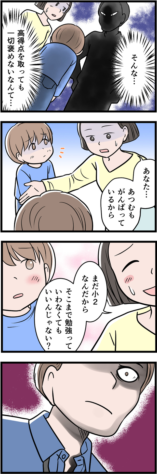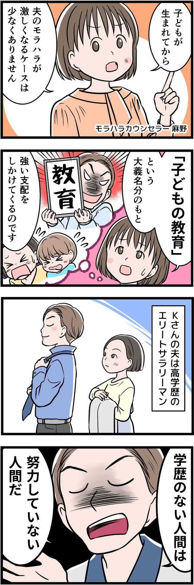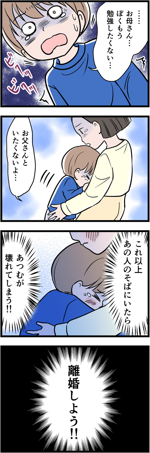 「一流大卒」が自慢の夫ですが、それ以外に何も自信をもてることがないため、コンプレックスの裏返しとして学歴自慢をしていたのです。幼い息子にまで「完璧」を押しつけ、ついに息子にストレスの身体症状が出てしまいます。それをみた妻は、ついに離婚を決意しましたが……。