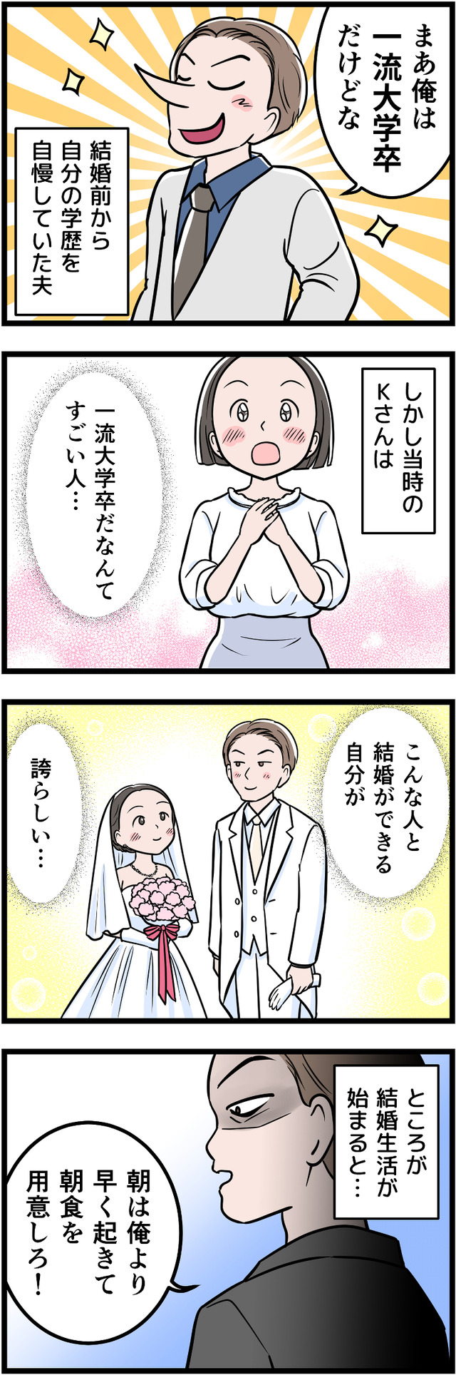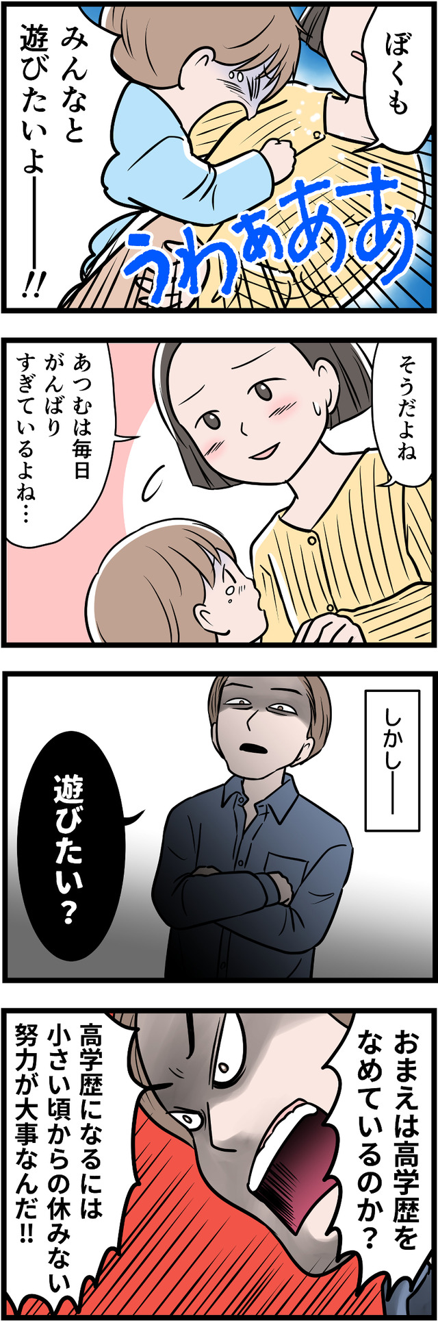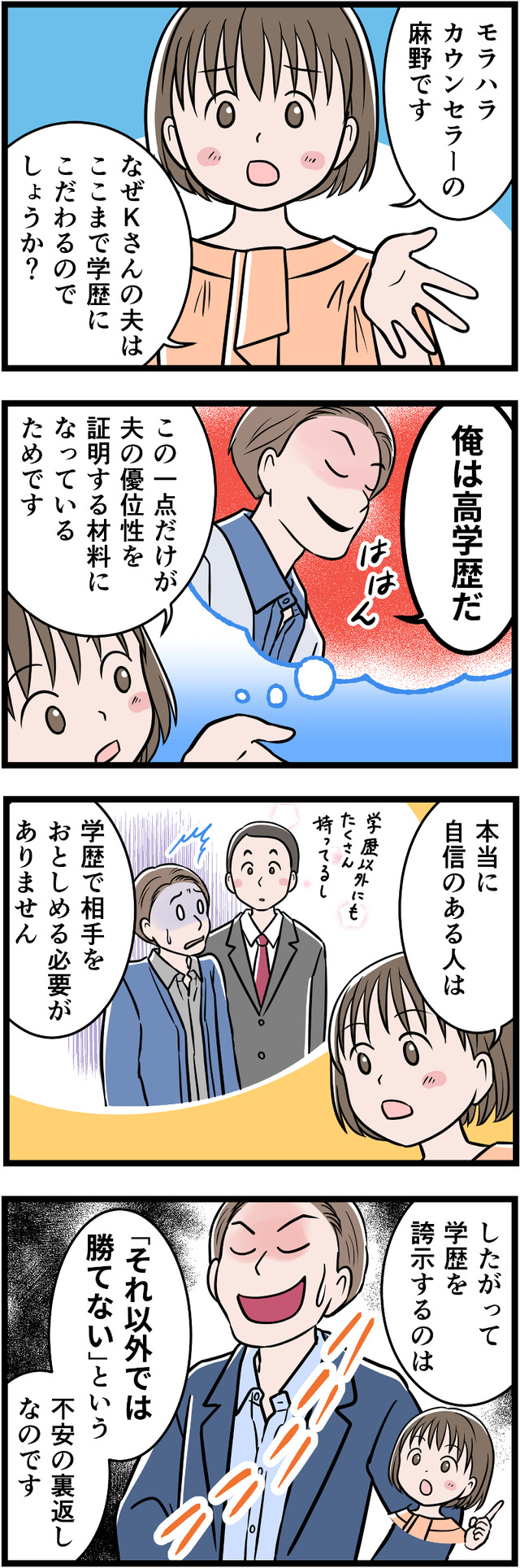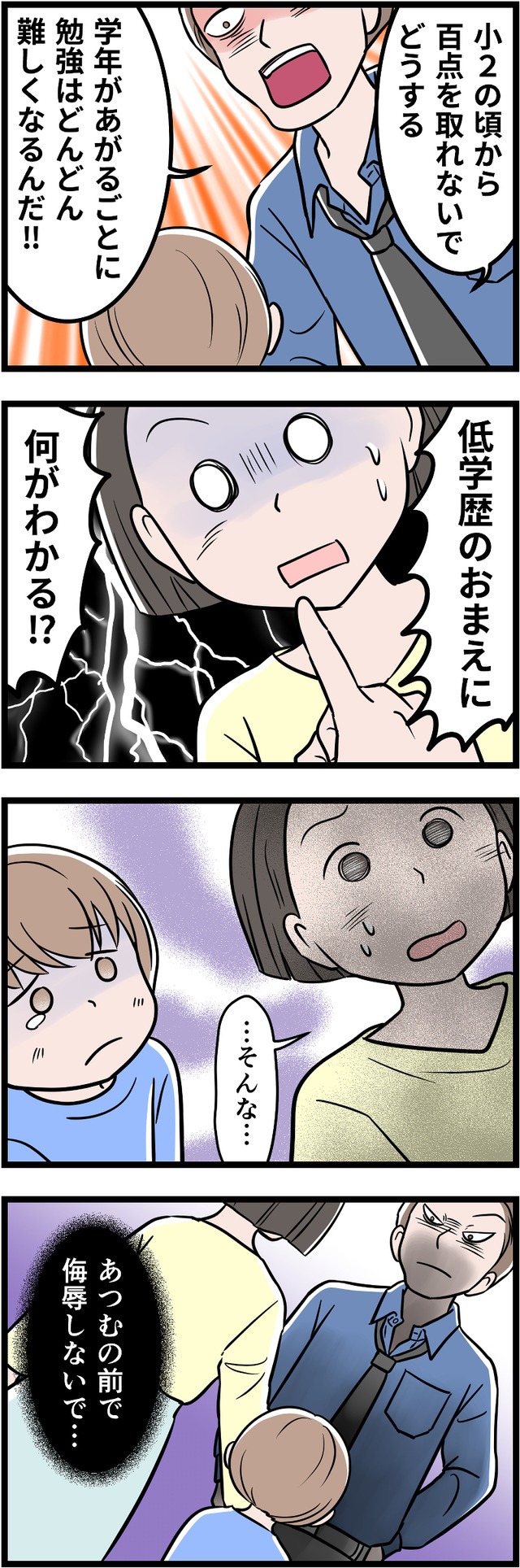 「一流大卒」が自慢の夫ですが、それ以外に何も自信をもてることがないため、コンプレックスの裏返しとして学歴自慢をしていたのです。幼い息子にまで「完璧」を押しつけ、ついに息子にストレスの身体症状が出てしまいます。それをみた妻は、ついに離婚を決意しましたが……。