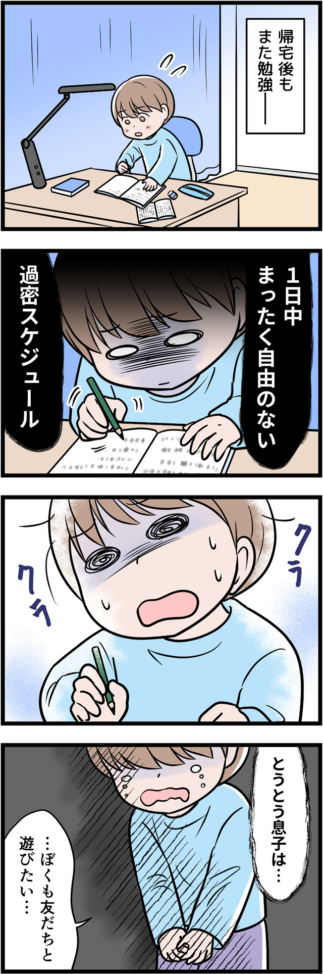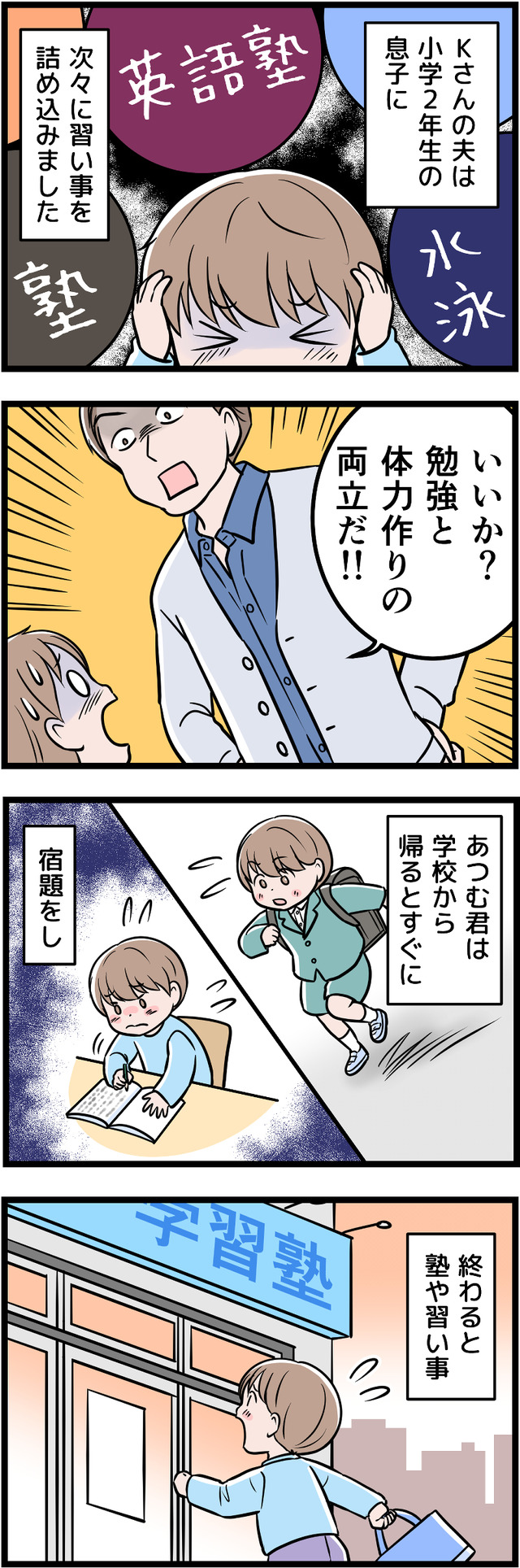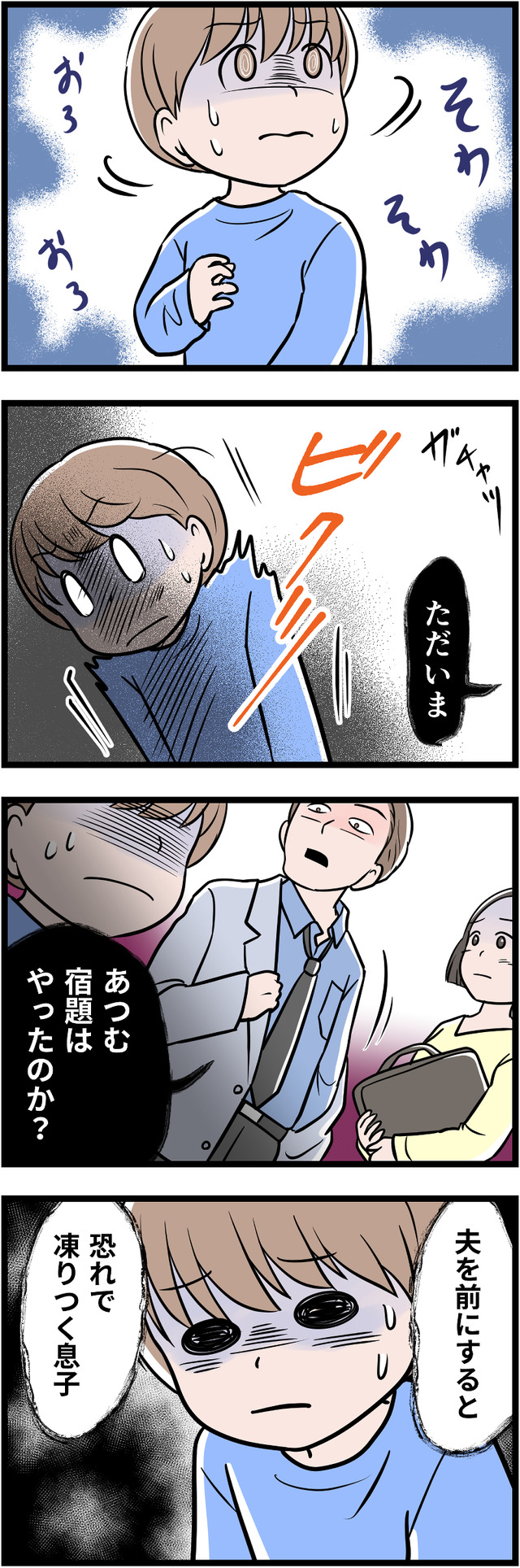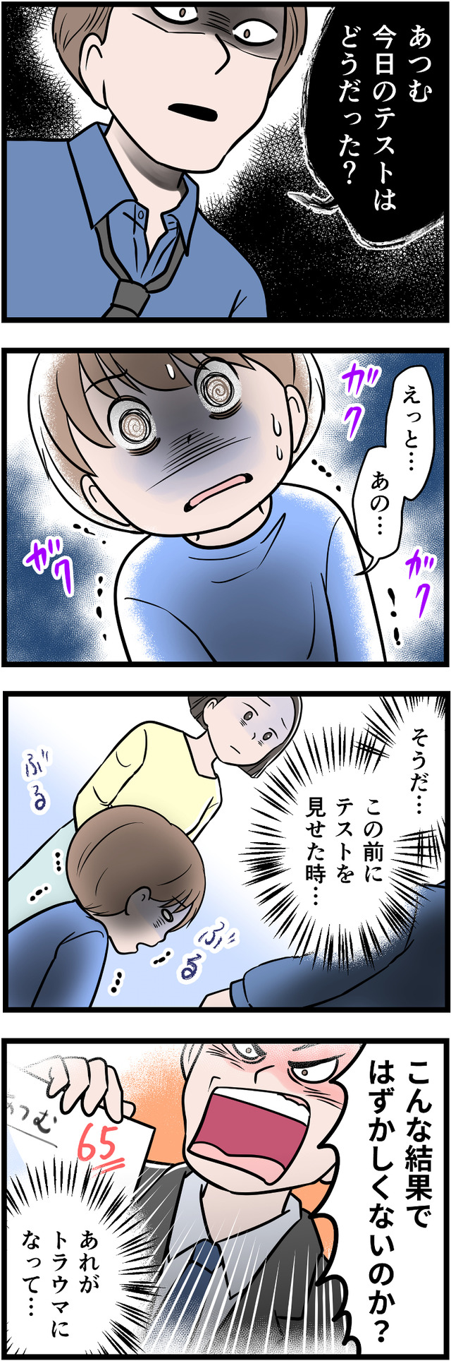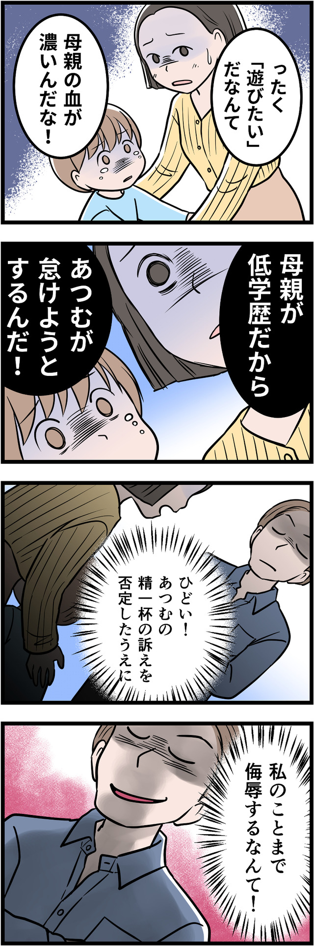 「一流大卒」が自慢の夫ですが、それ以外に何も自信をもてることがないため、コンプレックスの裏返しとして学歴自慢をしていたのです。幼い息子にまで「完璧」を押しつけ、ついに息子にストレスの身体症状が出てしまいます。それをみた妻は、ついに離婚を決意しましたが……。