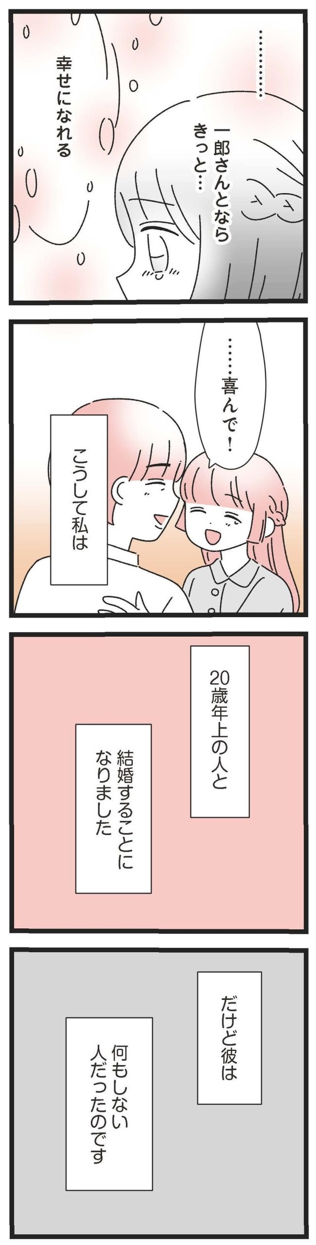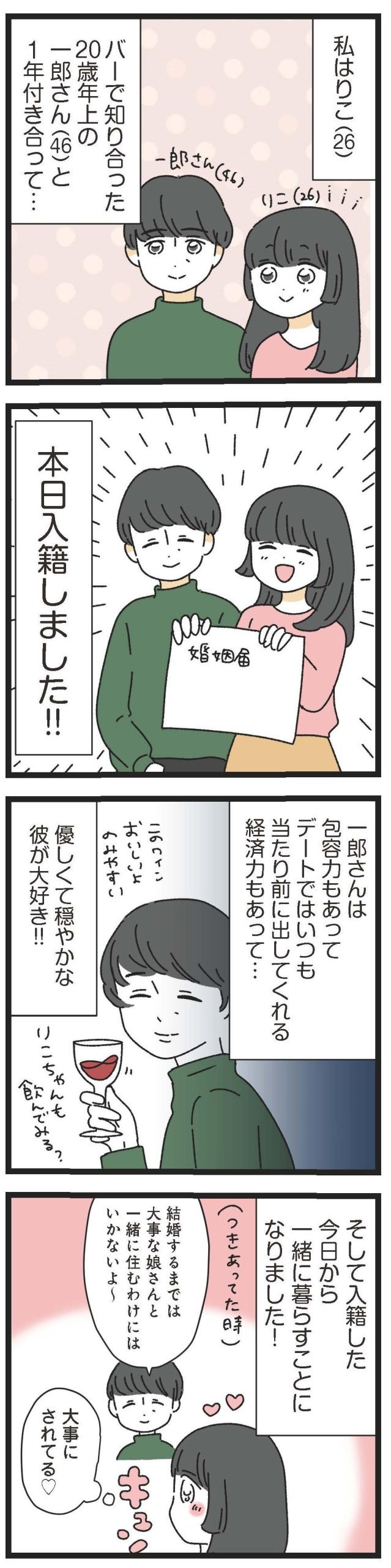シングルマザーの家庭で育ったりこは、父親のような包容力を持つ一郎に惹かれ、20歳の年の差を乗り越えて結婚する。