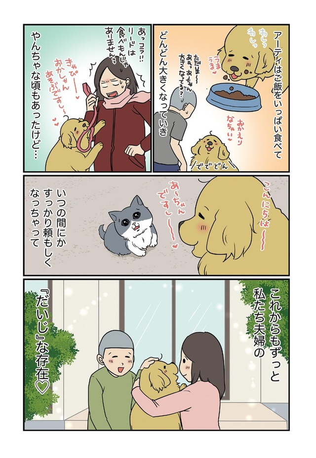 「ですし!」が口癖のゴールデンレトリーバー・アーティと、いつもイライラ怒ってばかりなのに家族思いなハチワレ猫・まめ。
