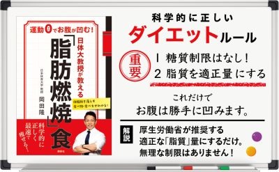 体のプロ・岡田先生が長年実践しているのが、体脂肪になりやすい脂質を適正化する「除脂肪食」。脂質を一切カットするのではなく、厚生労働省が推奨している1日の摂取量をもとに、摂り過ぎていた脂質を適量にするだけ。おやつを含め、1食10gを越えないことを意識した食事に変えることで、お腹に蓄積された体脂肪が徐々に落ちていくというわけです。「除脂肪」は、脂質を抜くのではなく、体脂肪を取り除く意味。もちろん、現代人は脂質過多になっているので、食事の脂質を減らす(適正化)という意味も含まれています。