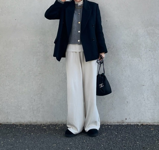 puu326さんは、上下ユニクロのアイテムに華やかなゴールドボタンのニットカーディガンを合わせた、品格漂うカジュアルスタイルを提案しています。インナーにはユニクロの「ソフトリブタートルネックT」1,990円(170cmでサイズM着用)をセレクトし、ボトムスには「スウェットワイドパンツ」2,990円(170cmでサイズM着用)を組み合わせて、リラックス感のある着こなしに。カジュアルなスウェットも、ハリのある素材のカーディガンを羽織るだけで、一気にジャケットのようなきちんと感が加わります。