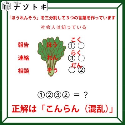 そこで「ホウレンソウ」を「ホウ」「レン」「ソウ」と三分割してみるとどうでしょうか。もしかすると「ホウレンソウ」の時点でピンときた人もいるかもしれません。