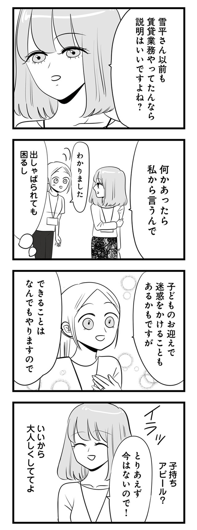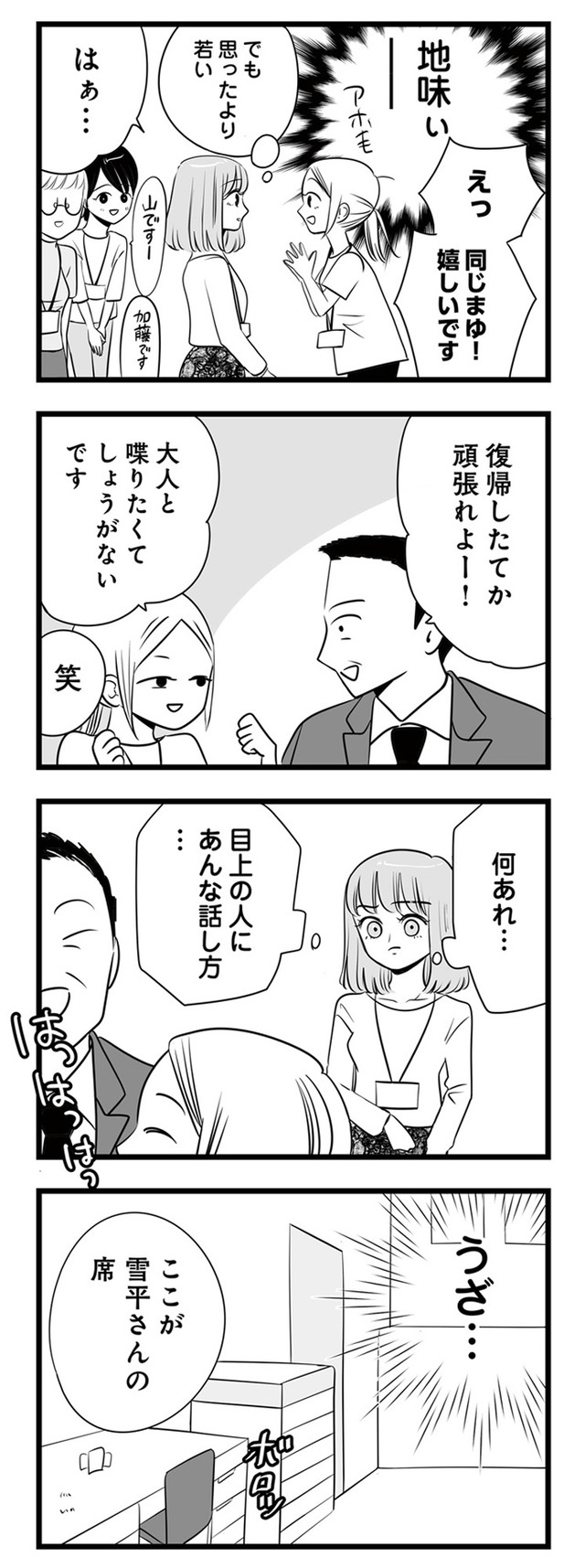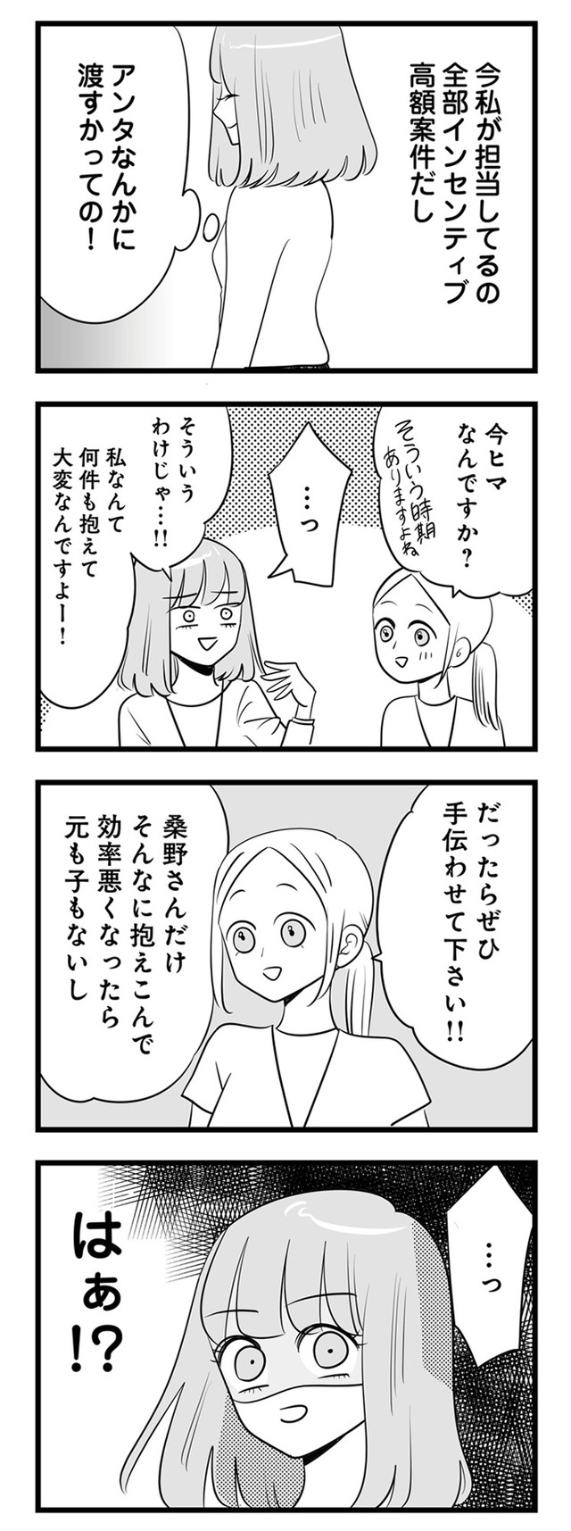 産休から戻った雪平の自然体な仕事ぶりと対人スキルにやきもきし、桑野は密かに雪平をライバル視する。