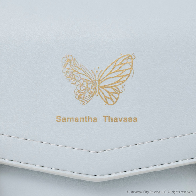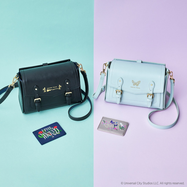 ショルダーバッグは、物語の中でエルファバ、グリンダが着用しているドレスをイメージしたカラー。エルファバの魔法を連想させるほうきのモチーフ、グリンダの優美な印象をイメージした光輝く蝶がそれぞれデザインされていている。