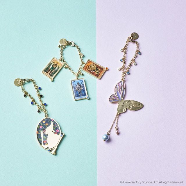 グリンダをイメージしたカラーの蝶モチーフ、ショルダーバッグの裏地と同様の総柄にエルファバのシルエットをデザインしたチャームは、物語に登場するキャラクターをデザインした3種がラインアップ。同シリーズのバッグとあわせて、コーディネートが楽しめる。