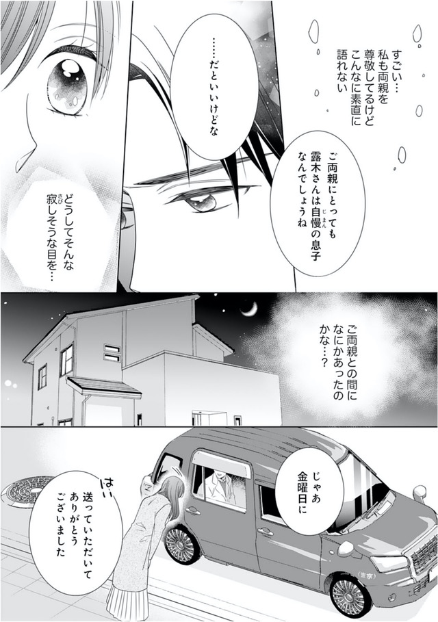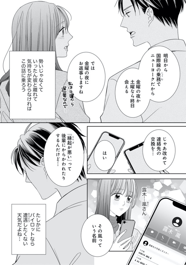パイロットの元恋人に裏切られた過去から縁談を断るつもりだったが、待ち合わせの場で露木も結婚する気がないと知り、ひと安心する。