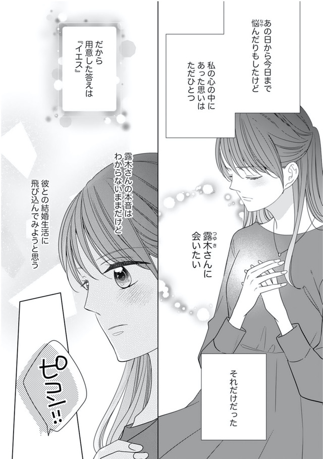 パイロットの元恋人に裏切られた過去から縁談を断るつもりだったが、待ち合わせの場で露木も結婚する気がないと知り、ひと安心する。