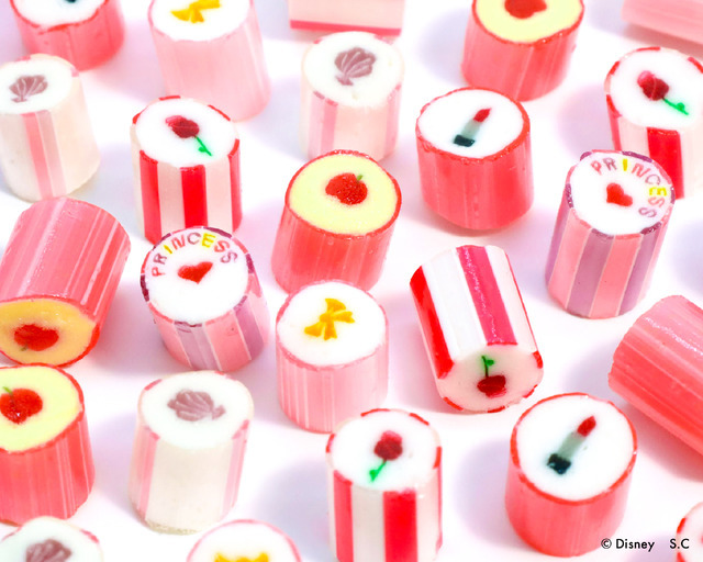 2023年に発売された、「ディズニープリンセス/キャンディミックス」は、白雪姫をイメージしたリンゴ柄、『美女と野獣』ベルをイメージしたバラの絵柄など、プリンセスたちのアイコンやカラーをもとに、柔らかく上品な色合いで製造。“PRINCESS”の文字入りキャンディは、光にかざすと文字や絵柄が鮮明に浮かび上がる仕掛けも。