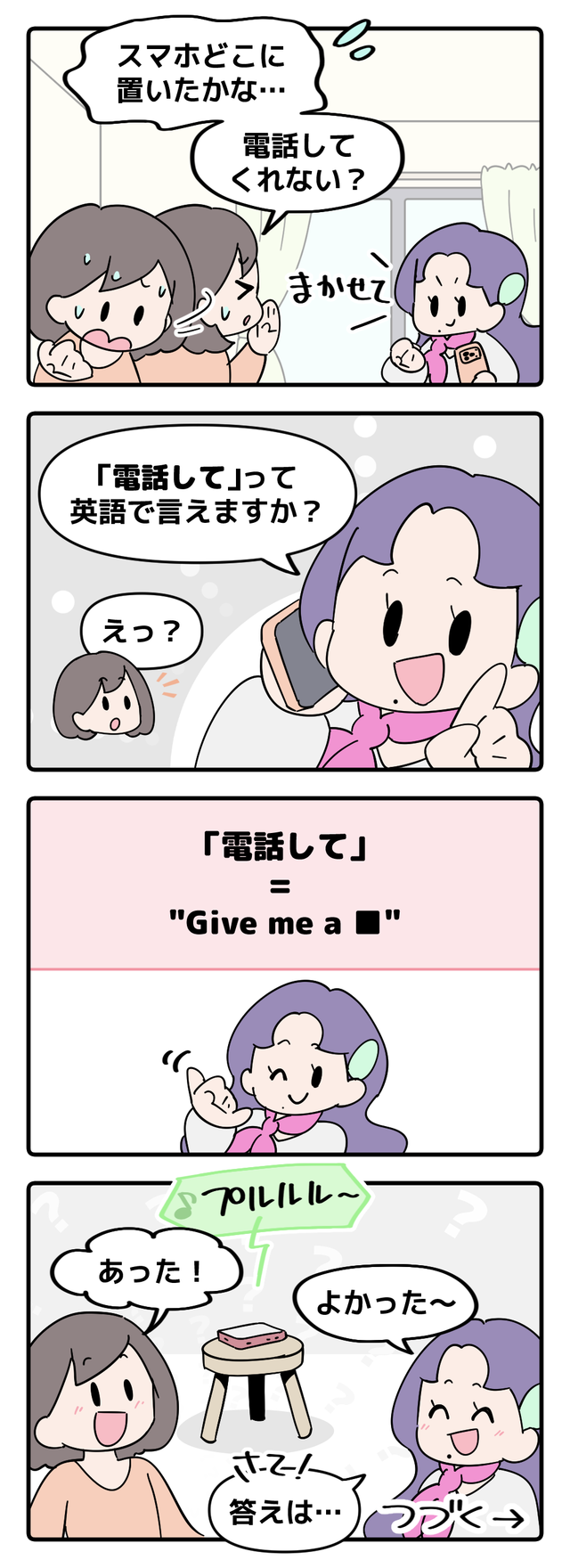 「英語嫌いな日本人をなくしたい!」海外生活や添乗員経験、そしてバイリンガル子育て中の英会話講師・Mrs.服部が、身近な英語表現を漫画&クイズ形式でお届け! 「間違ったら恥ずかしい」じゃなく「伝わればOK」。使えるフレーズをマンガで学びましょう!