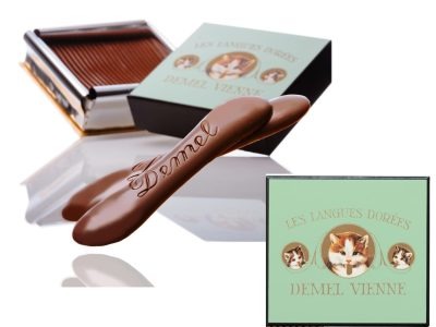 【デメル】猫パッケージがキュートすぎ! デメルを代表する猫の舌の形をしたチョコレート。ミルクのほか、スウィート、ヘーゼルナッツの3種あり