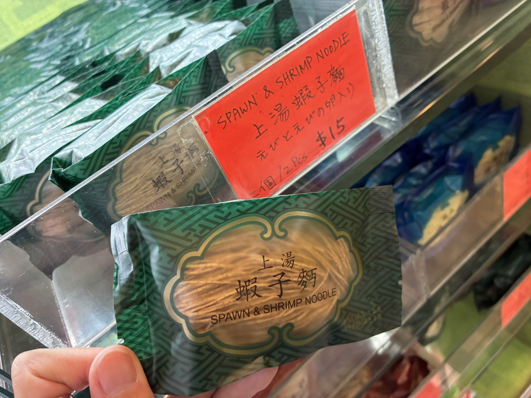 日本で香港ヌードルというと玉子麺が代表的ですが、蝦の卵を練り込んだ蛯子麺はより風味がよいのでお勧めとのこと。これもひとついただいていきます。鮑魚麺(あわび)も人気です。