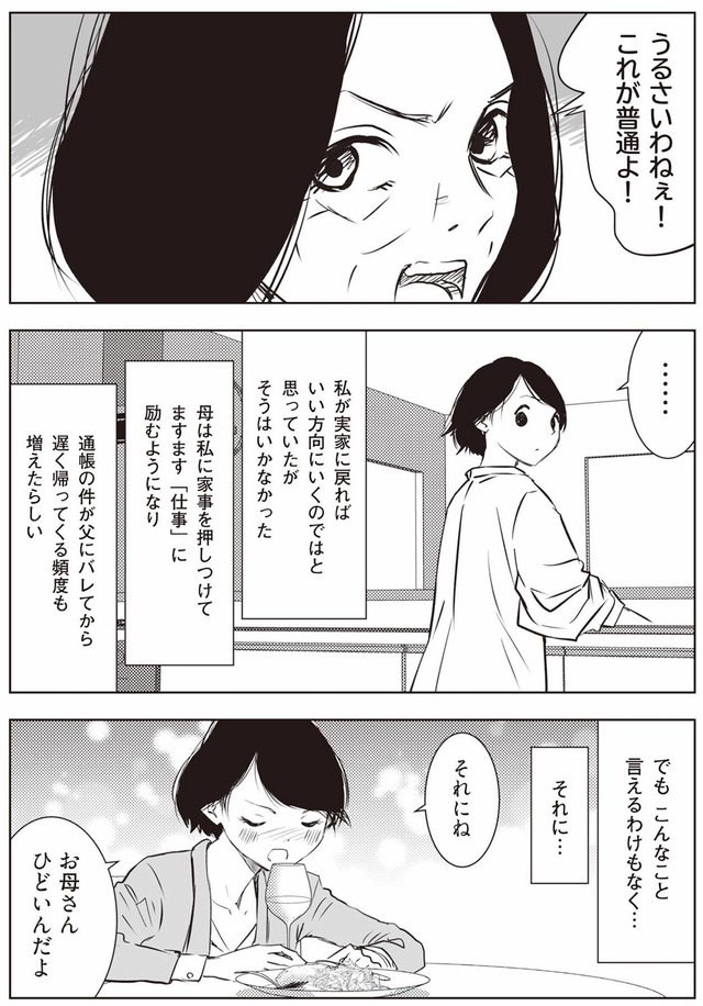 6年勤めた仕事を辞め、実家に戻った翔子は、母が父の退職金を口座から引き出し、使い込んでいると知らされる。